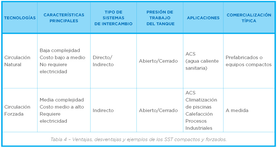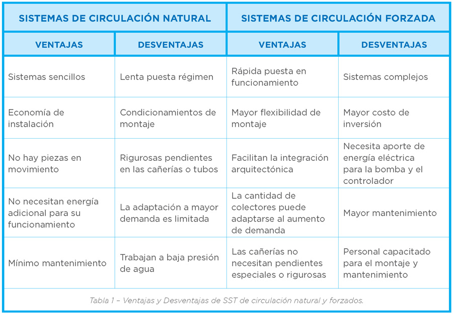 La tabla 1 muestra las ventajas y desventajas de cada uno de los sistemas de circulación natural y forzada.