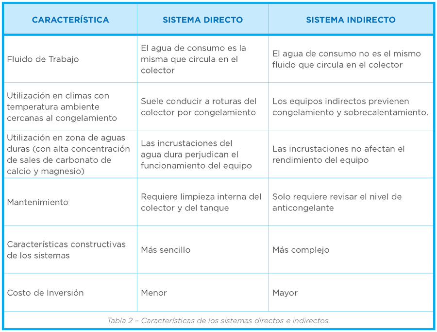 En la tabla 2 se detallan las principales características de los sistemas directos e indirectos.