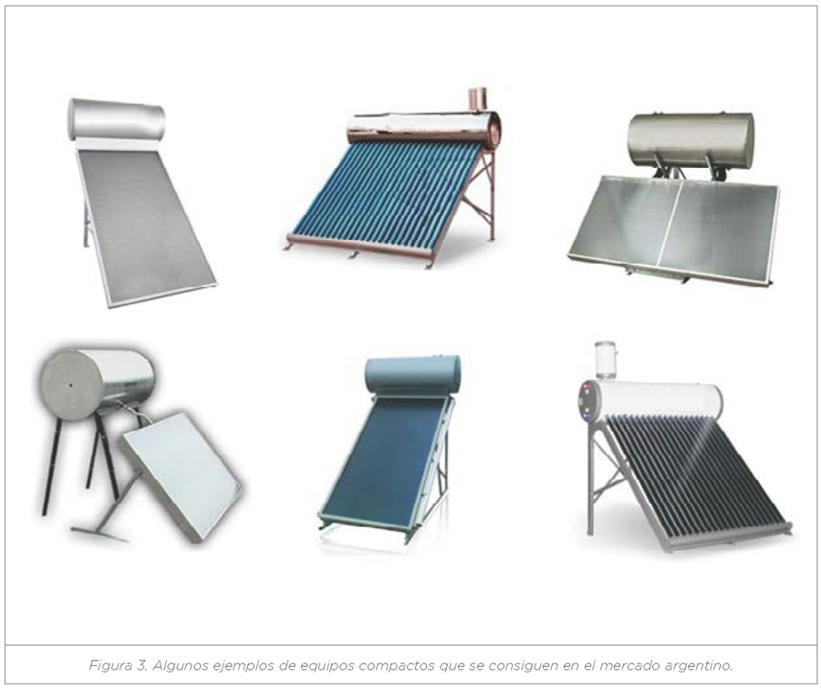 En el equipo compacto, el colector y el tanque conforman un solo producto. A nivel mundial, los equipos compactos constituyen el 70% del mercado de la energía solar térmica [1]. Como se explicó anteriormente, están formados por un colector y un tanque que junto con una estructura y otros accesorios se comercializan como un solo producto. Al comercializarse como un solo producto, el equipo compacto debe cumplir con los mismos requisitos que los colectores y los tanques, con la excepción de que deben ser ensayados en forma conjunta de la misma forma en que irían instalados. En la figura 3 se muestran algunos ejemplos de equipos compactos que se comercializan en Argentina.